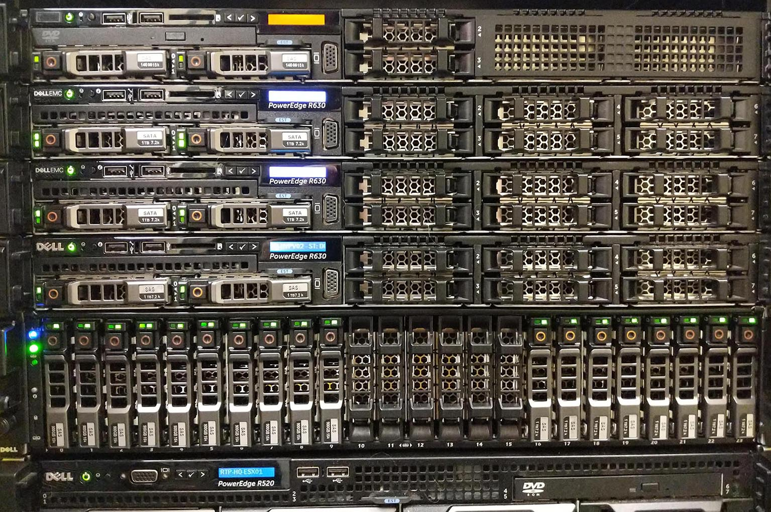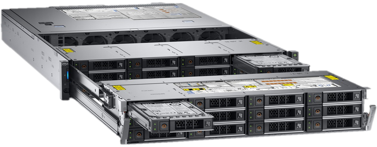 Серверы Dell 12-ого и 13-ого поколений, установленные в стойку и объединённые в кластер.
