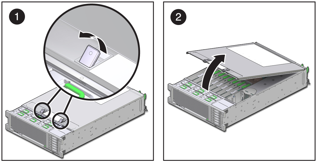 У разных вендоров крышка снимается по-разному. На одних серверах нужно вставить пальцы под защёлки, поднять их и снять крышку.